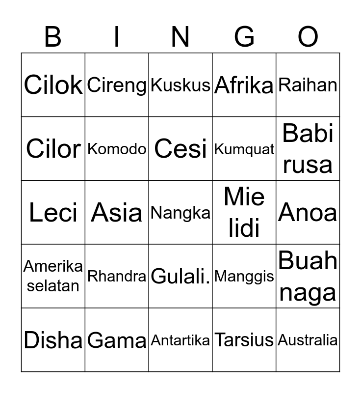 This bingo card has a free space and 24 words: Rhandra, Gama, Cesi, Disha, Raihan, Cilok, Cilor, Cireng, Mie lidi, Gulali., Kumquat, Leci, Manggis, Buah naga, Komodo, Tarsius, Anoa, Kuskus, Babi rusa, Asia, Australia, Amerika selatan, Afrika and Antartika.