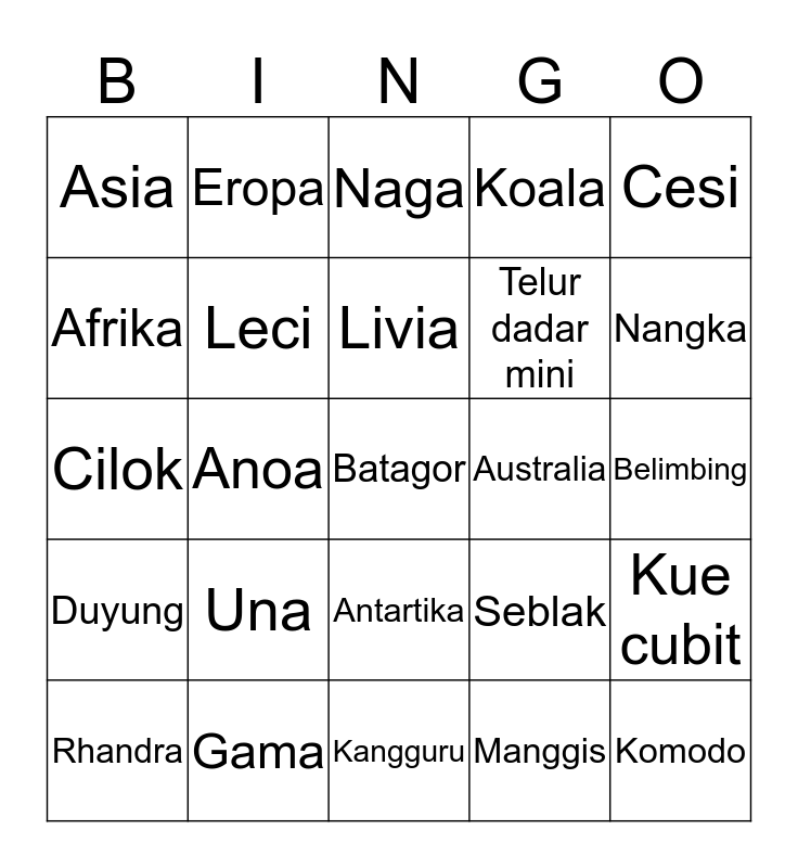 This bingo card has a free space and 24 words: Una, Gama, Livia, Rhandra, Cesi, Asia, Afrika, Eropa, Australia, Antartika, Telur dadar mini, Cilok, Seblak, Kue cubit, Leci, Manggis, Belimbing, Naga, Nangka, Anoa, Komodo, Duyung, Koala and Kangguru.