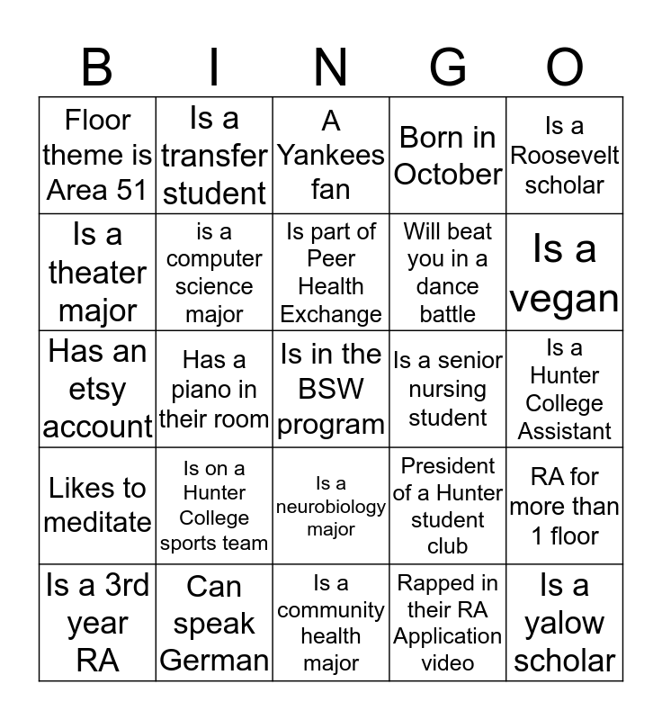 This bingo card has 25 words: Is on a Hunter College sports team, Is a community health major, Is part of Peer Health Exchange, Is a 3rd year RA, Is a Roosevelt scholar, Floor theme is Area 51, Is a theater major, Is a transfer student, Is a senior nursing student, Is a neurobiology major, Will beat you in a dance battle, Has an etsy account, President of a Hunter student club, RA for more than 1 floor, is a computer science major, Is a yalow scholar, Is a Hunter College Assistant, A Yankees fan, Is a vegan, Has a piano in their room, Is in the BSW program, Can speak German, Likes to meditate, Born in October and Rapped in their RA Application video.