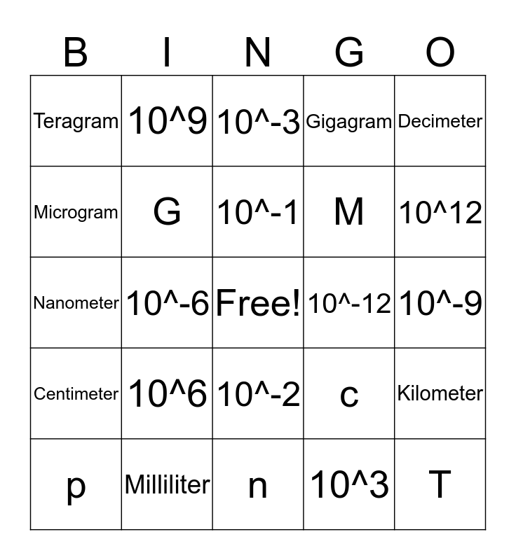 This bingo card has a free space and 28 words: Kilometer, Megagram, M, 10^3, Microgram, 10^-3, 10^9, Centimeter, 10^-12, p, Nanometer, Gigagram, Milliliter, n, 10^12, g, 10^6, G, 10^-1, 10^-2, Teragram, Picogram, T, 10^-6, 10^-9, c, Decimeter and m.
