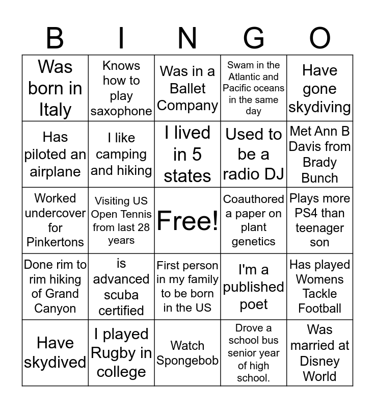 This bingo card has a free space and 28 words: Has played Womens Tackle Football, Is not a fan of chocolate, Used to be a radio DJ, Drove a school bus senior year of high school., Has piloted an airplane, Was in a Ballet Company, Knows how to play saxophone, Done rim to rim hiking of Grand Canyon, Coauthored a paper on plant genetics, Have skydived, Worked undercover for Pinkertons, Swam in the Atlantic and Pacific oceans in the same day, I played Rugby in college, Watch Spongebob, Met Ann B Davis from Brady Bunch, For 29 years i have been trying to get rid of Russian accent - no success, is advanced scuba certified, I like camping and hiking, I lived in 5 states, First person in my family to be born in the US, Was born in Italy, Has never played Bingo, Was married at Disney World, Visiting US Open Tennis from last 28 years, Plays more PS4 than teenager son, I'm a published poet, Have gone skydiving and Had a monkey as a pet.