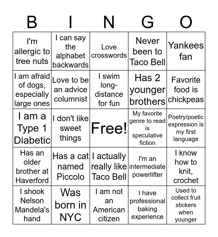 This bingo card has a free space and 55 words: My 1st job was with Renaissance Faire, I shook Nelson Mandela's hand, 5X Iowa State Fair blue ribbon winner for chess, I'm allergic to tree nuts, I am not an American citizen, Stole my sister's diary & annotated it, Love to be an advice columnist, Badminton player at Swat, Has 2 younger brothers, Has been in Seussical the Musical, Never been to Taco Bell, Loves wearing sunset colors, Hates the cold, Afraid of Horses, Had to shave my eyebrows once, Been to Ghana, Yankees fan, I don't like sweet things, Hot pot is my favorite food, Used to collect fruit stickers when younger, My favorite genre to read is speculative fiction, I have 7.3k Youtube subscribers, I'm an intermediate powerlifter, Love crosswords, I'm really good at hand-whistling, I swim long-distance for fun, I have professional baking experience, Aspires to be a professional Spotify playlist creator, Poetry/poetic expression is my first language, I know how to knit, crochet, Has a pet tortoise and built a 2-story house for him/her, Loves standup comedy, I follow politics very closely, I was born in Guyana, I am afraid of dogs, especially large ones, I am a Type 1 Diabetic, Spent 6 months last year living in Southern France, Has an older brother at Haverford, Can't stay awake through entire movies, Took aerial silk classes in Madrid, I can say the alphabet backwards, I almost always wear my socks inside out, Started a bone collection with bones found in Crum, Played the piano for 13 years, Has a cat named Piccolo, Was born in NYC, Has a dog named Loki, I'm a licensed aerial photographer, My family is exiled from Iran, Favorite food is chickpeas, Got to walk around Iceland because of a cancelled flight, Led a kazoo trio in high school, At age 12 was inducted into International Brotherhood of Magicians, I actually really like Taco Bell and I play guitar.