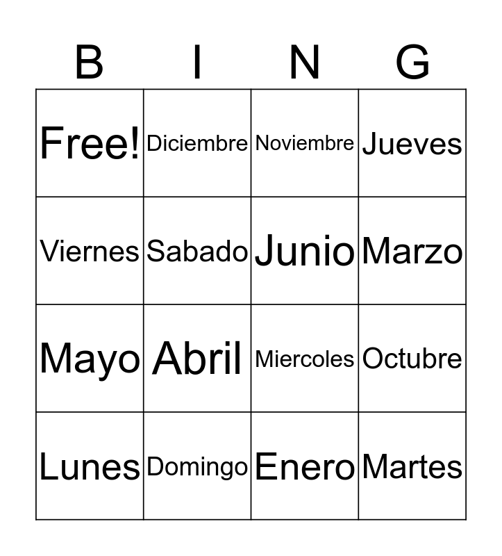 This bingo card has 16 words: Lunes, Domingo, Noviembre, Jueves, Viernes, Diciembre, Miercoles, Octubre, Free!, Sabado, Enero, Marzo, Mayo, Abril, Junio and Martes.
