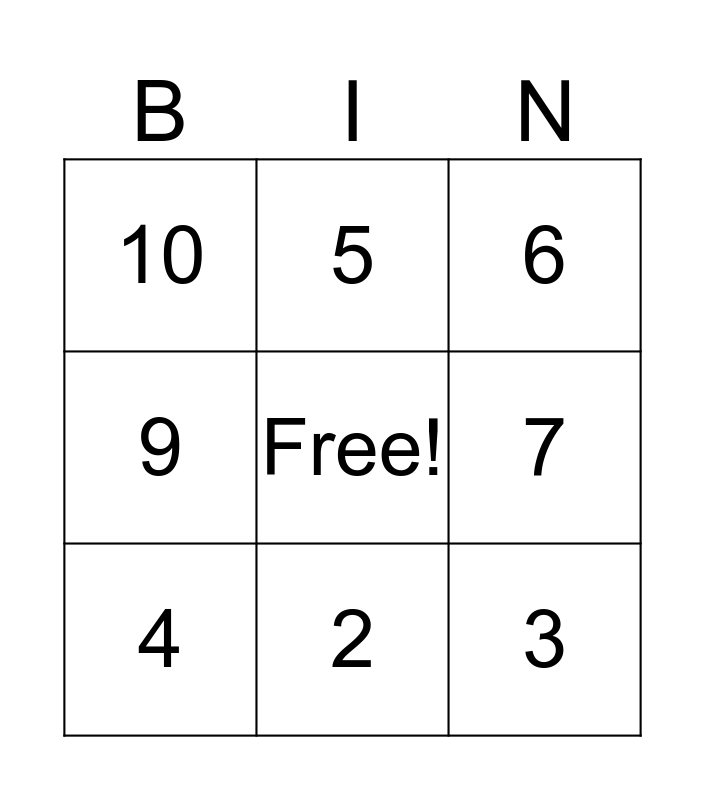 This bingo card has a free space and 11 words: 1, 2, 3, 4, 5, 6, 7, 8, 9, 10 and 0.