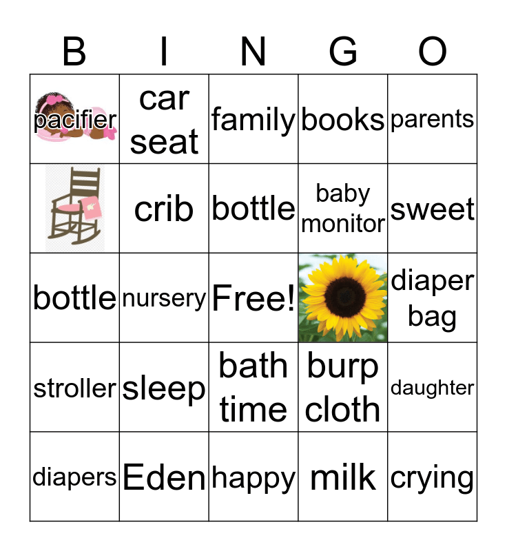 This bingo card has 4 images, a free space and 24 words: blanket, sleep, happy, milk, sweet, pacifier, car seat, family, baby monitor, daughter, bottle, nursery, burp cloth, crying, stroller, Eden, bottle, parents, diapers, crib, bath time, books, diaper bag and swaddle.