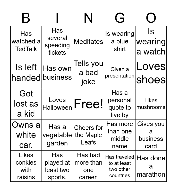 This bingo card has a free space and 60 words: Has worked for 5 yrs or more, Has played at least two sports., Knows how to cook., Owns a white car., Has traveled to at least two other countries, Has sung karaoke, Has own business, Jumped in a Crop Over Band, Given a presentation, Owns a pet, Is wearing a blue shirt, Read a book in the last week, Is left handed, Plays/ed a musical instrument, Been to the museum before for a tour, Has watched a TedTalk, Has done a marathon, Is wearing a watch, Been to a networking event before, Tells you a bad joke, Has a personal quote to live by, Meditates, Likes conkies with raisins, Gives you a business card, Wears socks to bed, Has lived abroad, Kills houseplants, Cries over roadkill, Loves shoes, Cheers for the Raptors, Is a night owl, Is a neat freak, Enjoys golf, Is saving for a new car, Has several speeding tickets, Loves to read fantasy, Had a part time job at McDonalds or Walmart, Loves Halloween, Can name a Youtuber, Got lost as a kid, Has been on a cruise, Has a vegetable garden, Likes mushrooms, Prefers Pepsi over Coke, Has more than one middle name, Has broken a bone., Owns a Disney movie on VHS., Drinks more than two cups of coffee daily., Has seen the Pope in person, Cheers for the Maple Leafs, Has had more than one career., Loves Netflix., Enjoys doing laundry, Reads music, Has never gotten a speeding ticket, Has a relative in teaching, Has a part time job, Likes to do crafts, Has more than one pet and Watches soap operas.