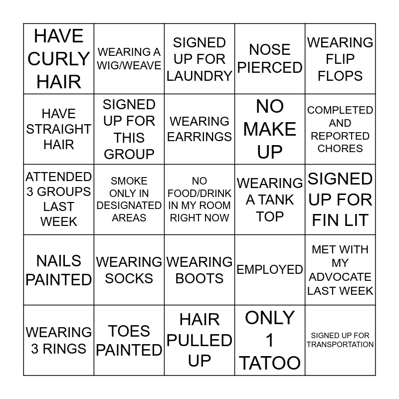 This bingo card has 25 words: WEARING SOCKS, HAIR PULLED UP, WEARING EARRINGS, WEARING 3 RINGS, WEARING FLIP FLOPS, HAVE CURLY HAIR, HAVE STRAIGHT HAIR, WEARING A WIG/WEAVE, WEARING A TANK TOP, WEARING BOOTS, NO MAKE UP, ATTENDED 3 GROUPS LAST WEEK, EMPLOYED, MET WITH MY ADVOCATE LAST WEEK, SIGNED UP FOR THIS GROUP, SIGNED UP FOR TRANSPORTATION, SIGNED UP FOR FIN LIT, SIGNED UP FOR LAUNDRY, COMPLETED AND REPORTED CHORES, SMOKE ONLY IN DESIGNATED AREAS, NO FOOD/DRINK IN MY ROOM RIGHT NOW, TOES PAINTED, NAILS PAINTED, NOSE PIERCED and ONLY 1 TATOO.