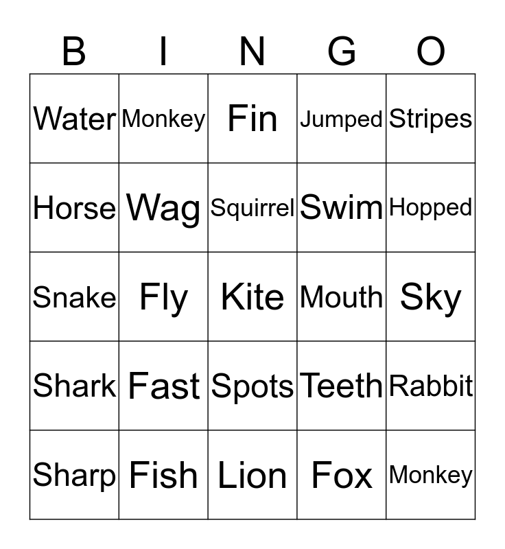 This bingo card has a free space and 25 words: Fast, Lion, Squirrel, Sharp, Stripes, Water, Horse, Monkey, Mouth, Spots, Swim, Snake, Teeth, Rabbit, Wag, Away, Sky, Fin, Hopped, Fly, Monkey, Fish, Shark, Jumped and Fox.