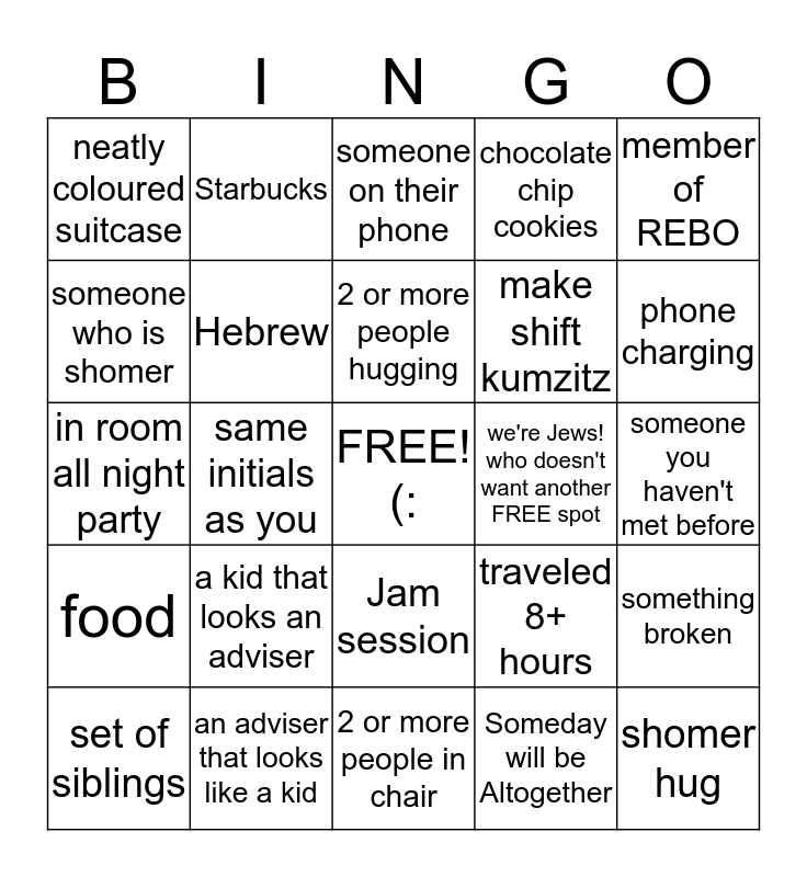 This bingo card has a free space and 24 words: a kid that looks an adviser, an adviser that looks like a kid, 2 or more people hugging, set of siblings, member of REBO, neatly coloured suitcase, someone who is shomer, Starbucks, we're Jews! who doesn't want another FREE spot, Jam session, make shift kumzitz, in room all night party, traveled 8+ hours, something broken, Hebrew, Someday will be Altogether, someone you haven't met before, someone on their phone, phone charging, same initials as you, shomer hug, food, chocolate chip cookies and 2 or more people in chair.