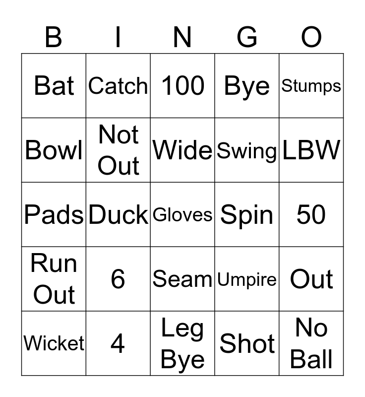This bingo card has a free space and 24 words: 6, 4, Wide, Wicket, Stumps, Bat, Bowl, Catch, Spin, Seam, Swing, Pads, Umpire, Out, Not Out, Shot, 50, 100, LBW, Duck, No Ball, Run Out, Bye and Leg Bye.