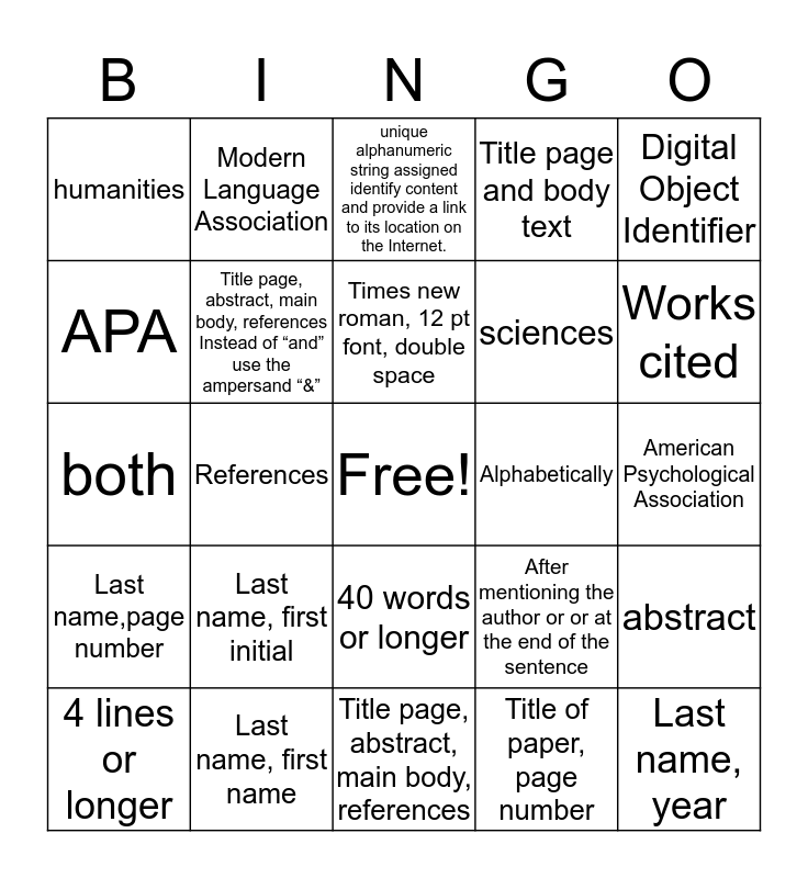 This bingo card has a free space and 24 words: Last name, first initial, Last name, first name, Times new roman, 12 pt font, double space, 4 lines or longer, Digital Object Identifier, humanities, APA, Modern Language Association, Alphabetically, 40 words or longer, sciences, both, After mentioning the author or or at the end of the sentence, abstract, Title page, abstract, main body, references Instead of “and” use the ampersand “&”, Title of paper, page number, American Psychological Association, unique alphanumeric string assigned identify content and provide a link to its location on the Internet., Works cited, References, Last name, year, Last name,page number, Title page and body text and Title page, abstract, main body, references.