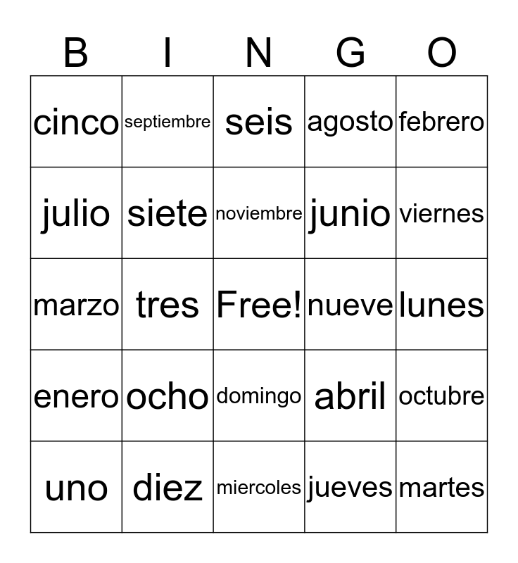This bingo card has a free space and 29 words: uno, dos, tres, cuatro, cinco, seis, siete, ocho, nueve, diez, lunes, martes, miercoles, jueves, viernes, sabado, domingo, enero, febrero, marzo, abril, mayo, junio, julio, agosto, septiembre, octubre, noviembre and diciembre.