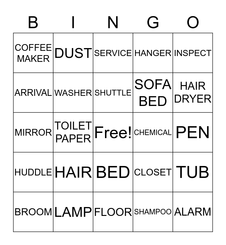 This bingo card has a free space and 29 words: BROOM, INSPECT, TOILET PAPER, SHOWER CAP, COFFEE MAKER, SERVICE, WASHER, HAIR, CHEMICAL, LAMP, PEN, ALARM, FLOOR, SHAMPOO, HAIR DRYER, F & B, BED, HUDDLE, INSPECT, MIRROR, CLOSET, TEA, SOFA BED, ARRIVAL, HANGER, DUST, TUB, SHUTTLE and TACOS.