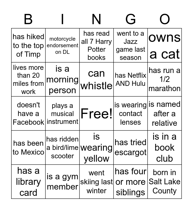 This bingo card has a free space and 34 words: reads the newspaper, has four or more siblings, born same month as you, likes pineapple on pizza, has been to Mexico, is a morning person, owns a cat, has a library card, motorcycle endorsement on DL, is left handed, can whistle, has read all 7 Harry Potter books, played a sport in high school, has been on TV, is wearing contact lenses, has run a 1/2 marathon, is a gym member, doesn't have a Facebook, has ridden a bird/lime scooter, has tried escargot, is wearing yellow, drives stick shift, has hiked to the top of Timp, is named after a relative, went skiing last winter, born in Salt Lake County, went to a Jazz game last season, knows how to knit, has Netflix AND Hulu, lives more than 20 miles from work, bought something online this week, plays a musical instrument, is in a book club and has sung in a choir.