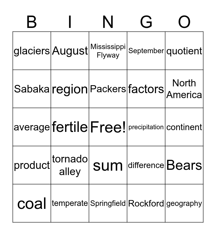 This bingo card has a free space and 29 words: coal, adaptation, fertile, fossil, glaciers, Mississippi Flyway, region, tornado alley, precipitation, temperate, continent, geography, Springfield, Rockford, North America, Illinois, sum, product, quotient, average, difference, Eagles, factors, Sabaka, September, August, Bears, Packers and Cubs.