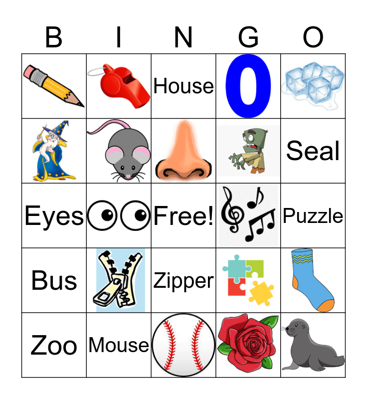 This bingo card has 24 images, a free space and 24 words: Dessert, Seal, Zoo, Baseball, Zipper, Bus, Whistle, Cheese, Wizard, Muscle, Mouse, Zero, Sock, Puzzle, Sun, Soap, Nose, Music, House, Ice, Eyes, Rose, Pencil and Zombie.