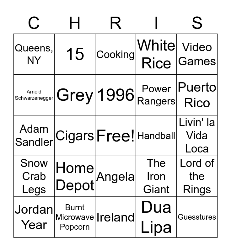 This bingo card has a free space and 32 words: Dua Lipa, Alaska, Cigars, Fishing, Snow Crab Legs, Grey, Video Games, Lord of the Rings, 15, Carvel Crunchies, 1996, Cooking, Summer 2017, Shadow, Handball, Virgo, Jordan Year, Adam Sandler, Angela, Home Depot, The Iron Giant, Volleyball, Livin' la Vida Loca, Burnt Microwave Popcorn, Guesstures, White Rice, Power Rangers, Arnold Schwarzenegger, Queens, NY, Ireland, 01 and Puerto Rico.