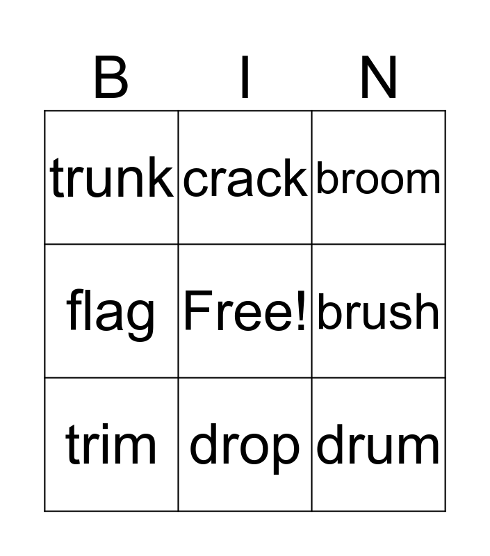 This bingo card has a free space and 20 words: truck, crab, broom, black, tree, drum, brim, trunk, floss, crack, brick, crib, brush, frog, trim, prince, drop, flag, trick and drill.