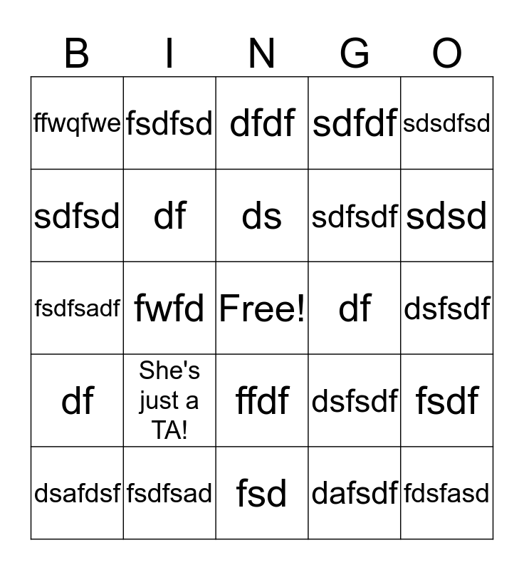 This bingo card has a free space and 24 words: She's just a TA!, fsdfsad, ds, dsafdsf, sdsdfsd, ffwqfwe, sdfsd, fsdfsd, df, ffdf, sdfsdf, fsdfsadf, dsfsdf, fsdf, df, dafsdf, dsfsdf, dfdf, sdsd, fwfd, fdsfasd, df, sdfdf and fsd.