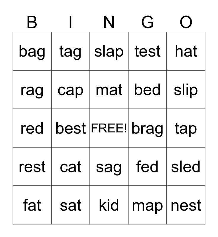 This bingo card has a free space and 24 words: cat, sat, mat, fat, hat, bag, rag, tag, brag, sag, bed, red, fed, sled, cap, map, tap, slap, slip, best, nest, rest, test and kid.