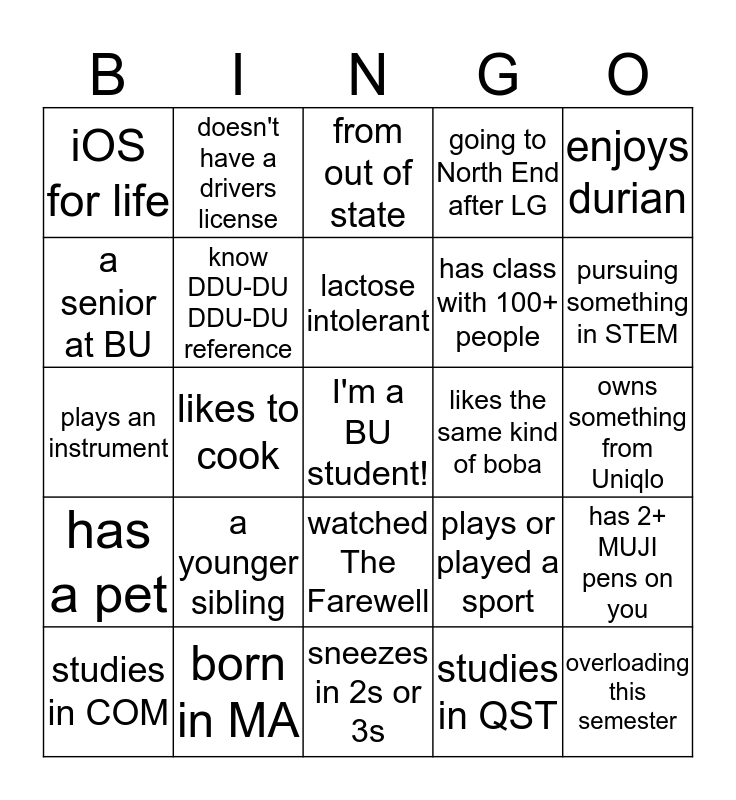This bingo card has a free space and 24 words: a younger sibling, born in MA, lactose intolerant, studies in COM, enjoys durian, iOS for life, a senior at BU, doesn't have a drivers license, likes the same kind of boba, watched The Farewell, has class with 100+ people, plays an instrument, plays or played a sport, has 2+ MUJI pens on you, know DDU-DU DDU-DU reference, studies in QST, owns something from Uniqlo, from out of state, pursuing something in STEM, likes to cook, overloading this semester, has a pet, going to North End after LG and sneezes in 2s or 3s.