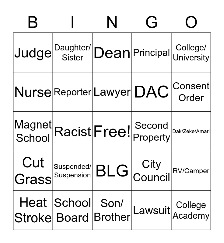 This bingo card has a free space and 27 words: Teacher, School Board, Lawyer, Lawsuit, College/ University, Nurse, Daughter/ Sister, Son/ Brother, Second Property, RV/Camper, Cut Grass, Reporter, City Council, College Academy, Magnet School, ACT, Dean, Principal, Dak/Zeke/Amari, Judge, Suspended/ Suspension, BLG, DAC, Consent Order, Heat Stroke, Racist and Car Line.