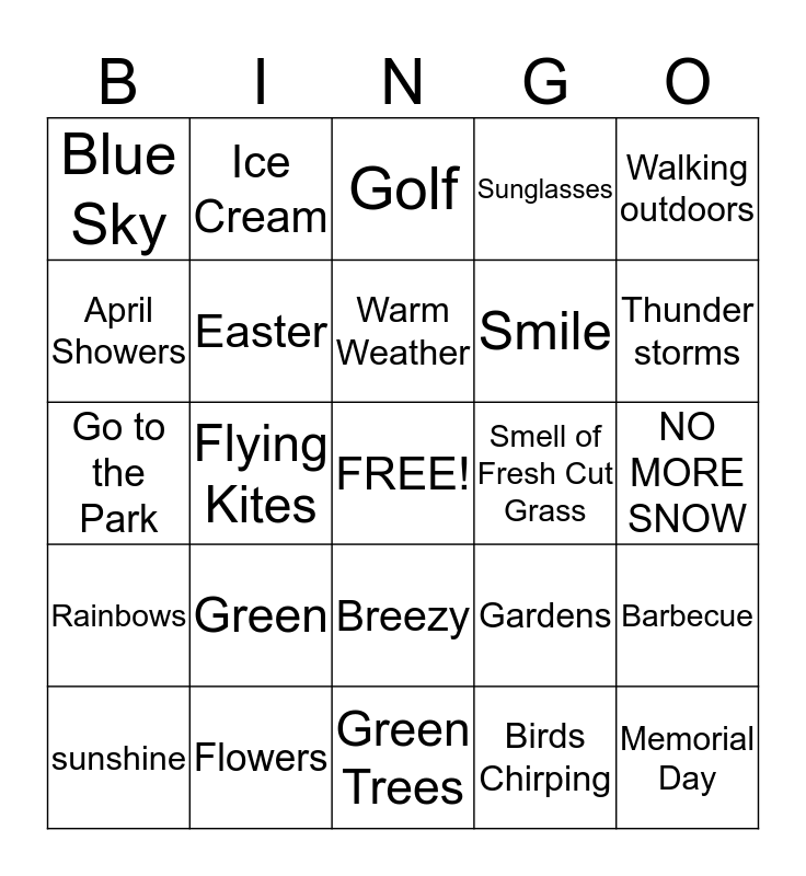 This bingo card has a free space and 24 words: Green, Flowers, Warm Weather, sunshine, Walking outdoors, Blue Sky, April Showers, Ice Cream, Smell of Fresh Cut Grass, Breezy, Smile, Go to the Park, Gardens, Barbecue, Easter, Birds Chirping, NO MORE SNOW, Golf, Thunder storms, Flying Kites, Memorial Day, Rainbows, Sunglasses and Green Trees.