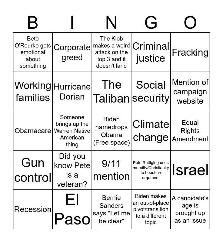 This bingo card has a free space and 24 words: Did you know Pete is a veteran?, El Paso, The Taliban, Recession, Fracking, Beto O'Rourke gets emotional about something, Working families, Corporate greed, Climate change, 9/11 mention, Social security, Obamacare, Pete Buttigieg uses morality/Christianity to boost an argument, Israel, Hurricane Dorian, Biden makes an out-of-place pivot/transition to a different topic, Equal Rights Amendment, The Klob makes a weird attack on the top 3 and it doesn't land, Mention of campaign website, Someone brings up the Warren Native American thing, A candidate's age is brought up as an issue, Gun control, Criminal justice and Bernie Sanders says "Let me be clear".