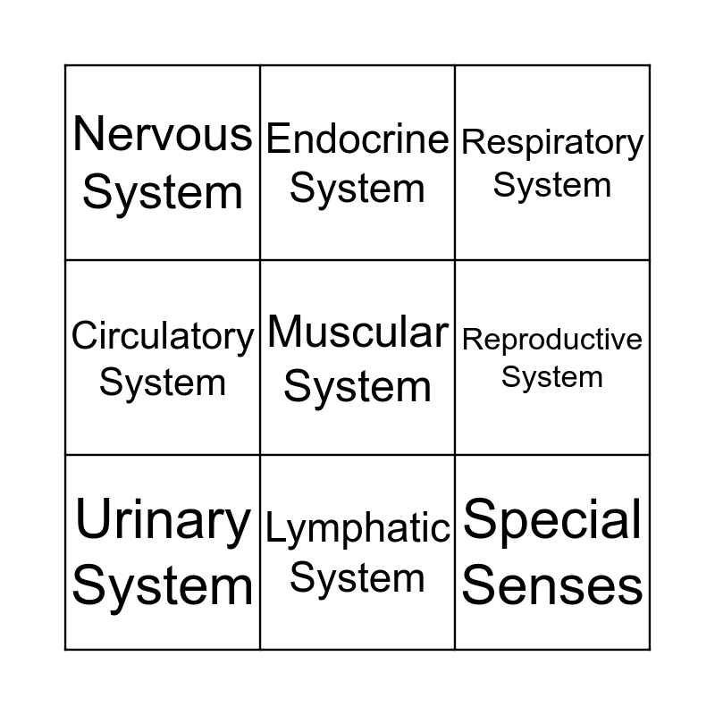 This bingo card has a free space and 11 words: Integumentary system, Skeletal System, Reproductive System, Urinary System, Respiratory System, Nervous System, Lymphatic System, Digestive System, Circulatory System, Endocrine System and Special Senses.