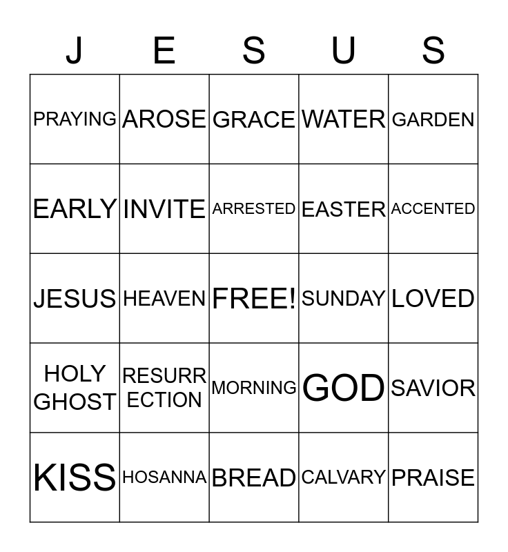 This bingo card has a free space and 24 words: RESURR ECTION, HOSANNA, ARRESTED, KISS, GARDEN, PRAYING, EARLY, AROSE, SUNDAY, MORNING, EASTER, JESUS, GOD, SAVIOR, INVITE, CALVARY, LOVED, GRACE, ACCENTED, HEAVEN, PRAISE, HOLY GHOST, WATER and BREAD.