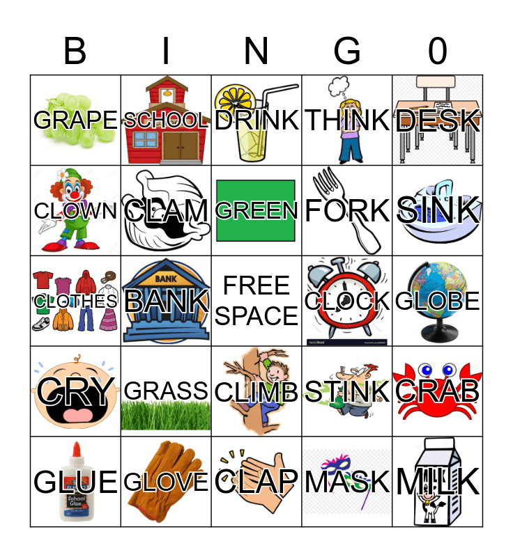 This bingo card has 24 images, a free space and 24 words: GRASS, GLOVE, GREEN, GLUE, DESK, GRAPE, CLOWN, SCHOOL, CLOCK, CLIMB, FORK, CLOTHES, STINK, CRAB, CLAM, MASK, GLOBE, DRINK, SINK, BANK, MILK, CRY, THINK and CLAP.