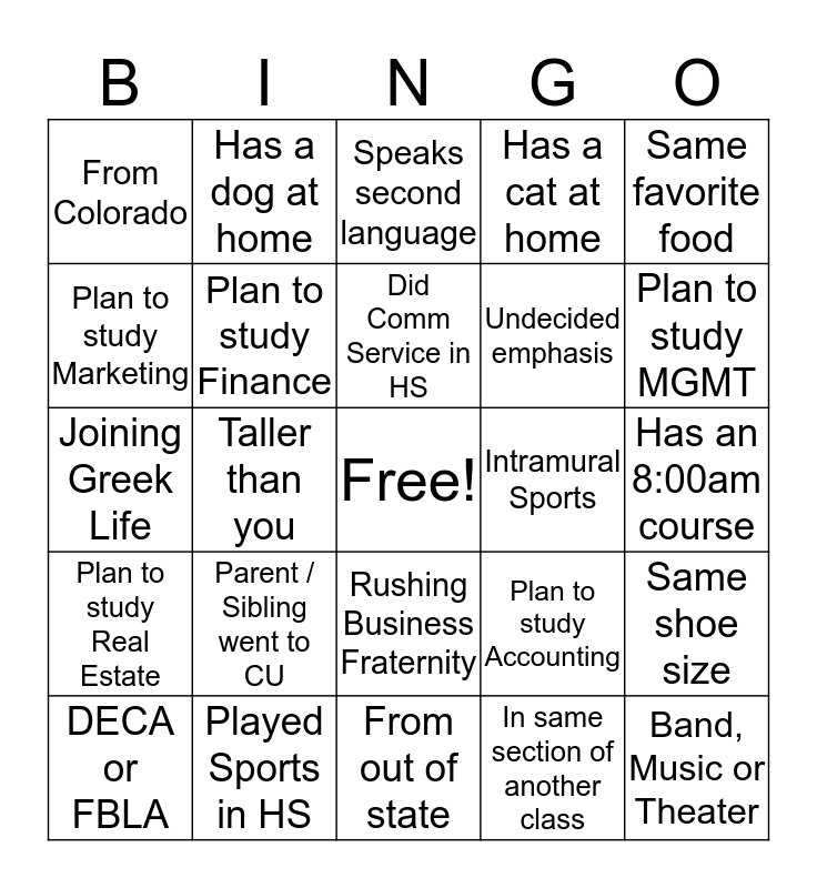 This bingo card has a free space and 24 words: Parent / Sibling went to CU, Played Sports in HS, Did Comm Service in HS, DECA or FBLA, Same favorite food, From Colorado, Plan to study Marketing, Has a dog at home, Intramural Sports, Rushing Business Fraternity, Undecided emphasis, Joining Greek Life, Plan to study Accounting, Same shoe size, Plan to study Finance, In same section of another class, Has an 8:00am course, Speaks second language, Plan to study MGMT, Taller than you, Band, Music or Theater, Plan to study Real Estate, Has a cat at home and From out of state.