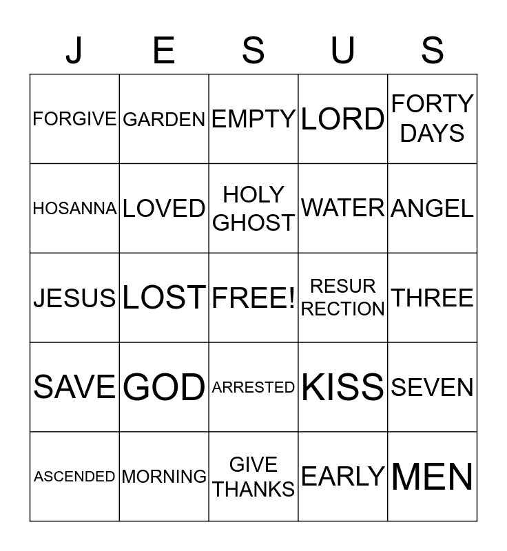 This bingo card has a free space and 24 words: GOD, MORNING, HOLY GHOST, ASCENDED, FORTY DAYS, FORGIVE, HOSANNA, GARDEN, RESUR RECTION, ARRESTED, WATER, JESUS, KISS, SEVEN, LOVED, EARLY, THREE, EMPTY, ANGEL, LOST, MEN, SAVE, LORD and GIVE THANKS.