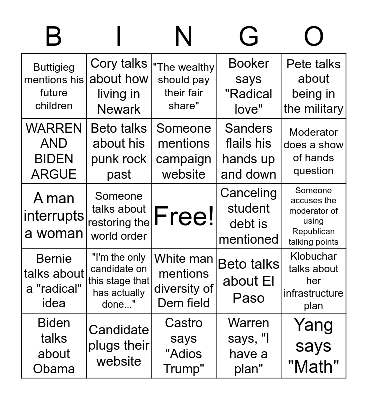 This bingo card has a free space and 34 words: Someone talks in Spanish, Warren says, "I have a plan", Pete talks about Mike Pence, Bernie talks about buying insulin in Canada, Bernie talks about a "radical" idea, Beto talks about his punk rock past, Pete talks about being in the military, Biden talks about Obama, Cory talks about how living in Newark, Harris talks about going after people as prosecutor, Someone mentions campaign website, "The wealthy should pay their fair share", Green New Deal, "The Republicans will call us socialists no matter what", Canceling student debt is mentioned, Moderator does a show of hands question, Candidate plugs their website, A man interrupts a woman, "I'm the only candidate on this stage that has actually done...", Beto talks about El Paso, White man mentions diversity of Dem field, Warren says "We need big structural change", Buttigieg mentions his future children, Someone accuses the moderator of using Republican talking points, Castro says "Adios Trump", Yang says "Math", Booker says "Radical love", Biden mentions "Restoring the soul of the nation", Sanders flails his hands up and down, WARREN AND BIDEN ARGUE, Talk about Trump inviting the Taliban to the US, Someone talks about restoring the world order, Klobuchar talks about her infrastructure plan and Someone talks about not being able to do anything without the Senate.