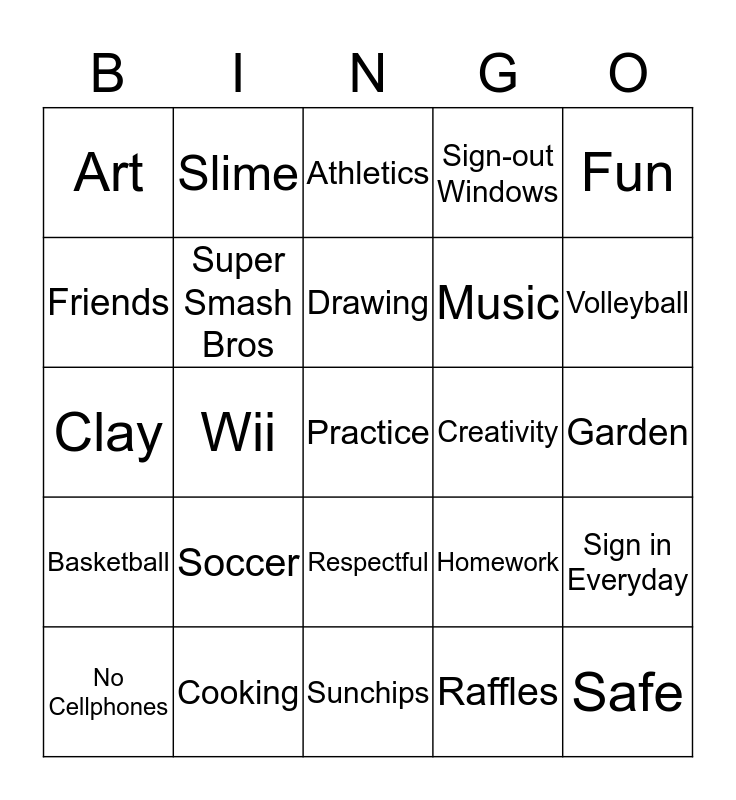 This bingo card has 30 words: Cooking, Very Berry Juice, Wii, Futsal, Art, Athletics, Super Smash Bros, Respectful, Creativity, Sunchips, Garden, Practice, Raffles, Safe, Volleyball, Painting, Homework, Basketball, Soccer, Fun, Clay, Express Yourself, Slime, Music, Friends, Sign-out Windows, Sign in Everyday, No Cellphones, Drawing and Sing.