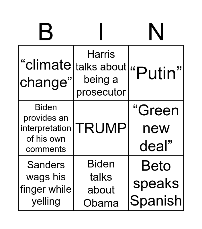 This bingo card has a free space and 11 words: “Medicare for all”, Biden talks about Obama, Beto speaks Spanish, Sanders wags his finger while yelling, Harris talks about being a prosecutor, “Putin”, “Green new deal”, “immigration”, Biden provides an interpretation of his own comments, “climate change” and Starts a sentence with “look,”.