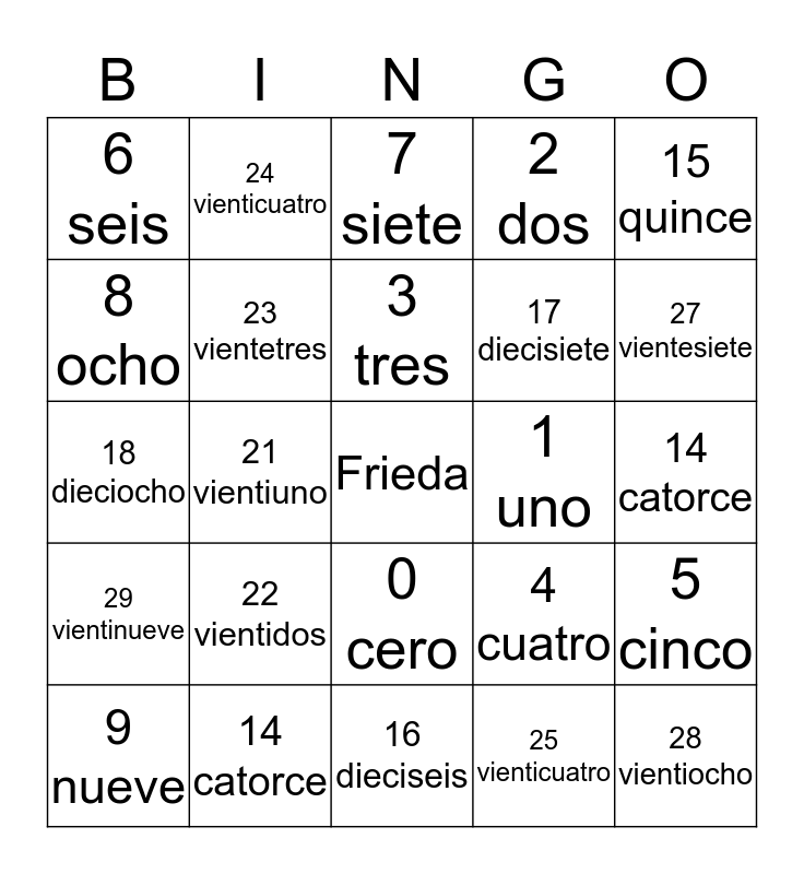 This bingo card has a free space and 24 words: 22 vientidos, 14 catorce, 3 tres, 9 nueve, 15 quince, 6 seis, 8 ocho, 24 vienticuatro, 1 uno, 0 cero, 17 diecisiete, 18 dieciocho, 4 cuatro, 5 cinco, 23 vientetres, 25 vienticuatro, 14 catorce, 7 siete, 27 vientesiete, 21 vientiuno, 28 vientiocho, 29 vientinueve, 2 dos and 16 dieciseis.