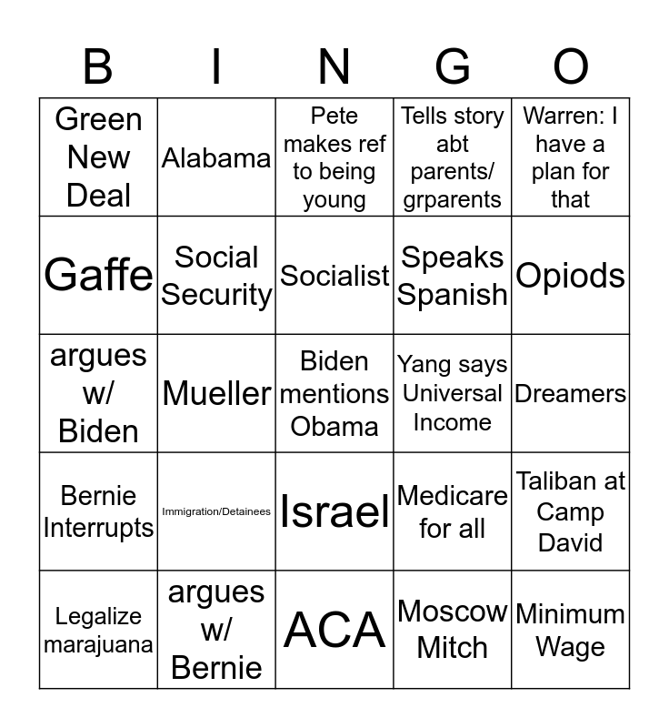 This bingo card has a free space and 31 words: ACA, Putin/ Russia, Mueller, Trump is unfit, Green New Deal, Pete makes ref to being young, Social Security, Medicare for all, Yang says Universal Income, Moscow Mitch, Dreamers, Minimum Wage, Student Debt, Plugs their website, Opiods, Ignores moderator when over time, Taliban at Camp David, Immigration/Detainees, Bernie Interrupts, Israel, Warren: I have a plan for that, Reparation, Legalize marajuana, Alabama, Speaks Spanish, Gaffe, Tells story abt parents/ grparents, argues w/ Biden, argues w/ Bernie, Socialist and impeach-ment.