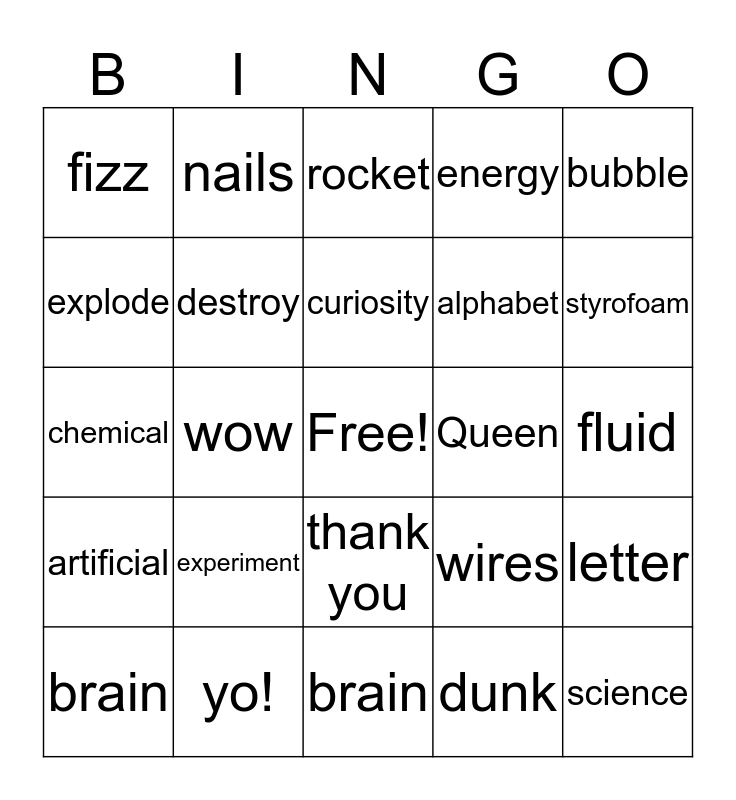 This bingo card has a free space and 24 words: experiment, yo!, curiosity, brain, bubble, fizz, explode, nails, Queen, thank you, alphabet, chemical, wires, letter, destroy, dunk, fluid, rocket, styrofoam, wow, science, artificial, energy and brain.