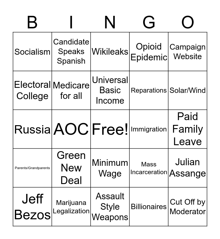 This bingo card has a free space and 40 words: Putin, Russia, Mueller, Medicare for all, Marijuana Legalization, Minimum Wage, Universal Basic Income, Obama, Campaign Website, Parents/Grandparents, AOC, Opioid Epidemic, Cut Off by Moderator, Paid Family Leave, Immigration, Green New Deal, Student Debt, Socialism, Hillary Clinton, Wikileaks, Julian Assange, Billionaires, Reparations, Electoral College, Abortion, Social Justice, Economic Justice, Environmental Justice, Income Inequality, Ice Caps, Twitter, Jeff Bezos, Institutions, Mass Incarceration, Solar/Wind, Assault Style Weapons, Red Flag, Golfing, Candidate Speaks Spanish and Endless Wars.