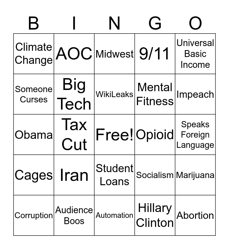 This bingo card has a free space and 29 words: Corruption, Someone cusses, Tax Cut, Minimum Wage, Climate Change, Midwest, Big Tech, Iran, Opioid, Audience Boos, Speaks Foreign Language, Abortion, Automation, Hillary Clinton, Impeach, Boomers, Student Loans, Cages, Universal Basic Income, Obama, Socialism, Electable, Mental Fitness, Someone Curses, 9/11, AOC, Marijuana, WikiLeaks and Electoral Collage.