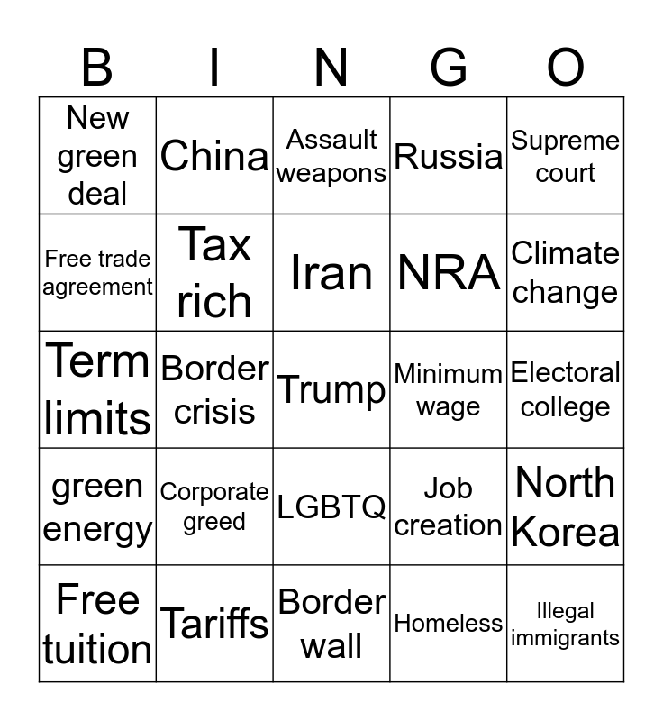 This bingo card has a free space and 29 words: Free tuition, Medicare for all, Border crisis, White supremacist, New green deal, Assault weapons, Tax rich, Corporate greed, Minimum wage, Tariffs, Electoral college, Illegal immigrants, Border wall, Homeless, Climate change, Abortion rights, LGBTQ, green energy, Supreme court, Term limits, Job creation, Separating families, NRA, Free trade agreement, Russia, China, North Korea, Iran and Israel.