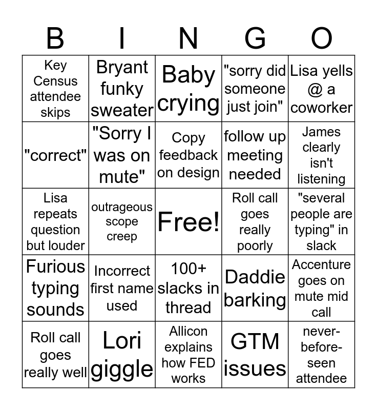 This bingo card has a free space and 29 words: Roll call goes really well, Alexandra arrives late, outrageous scope creep, "can someone go on mute", Key Census attendee skips, Baby crying, "Sorry I was on mute", Incorrect first name used, Roll call goes really poorly, Lori giggle, "several people are typing" in slack, never-before-seen attendee, Allicon explains how FED works, GTM issues, James clearly isn't listening, "Hello this is Thu", 100+ slacks in thread, Furious typing sounds, Lisa yells @ a coworker, Lisa repeats question but louder, Daddie barking, Michele talks about FAQs, follow up meeting needed, "correct", "sorry did someone just join", Bryant funky sweater, Accenture goes on mute mid call, Copy feedback on design and Team members disagree but politely.