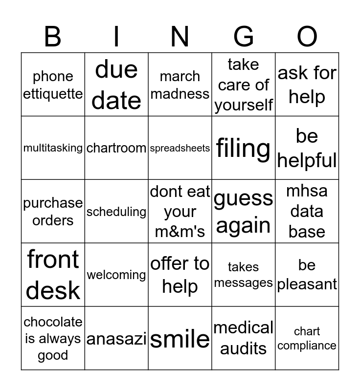 This bingo card has a free space and 24 words: welcoming, anasazi, spreadsheets, chocolate is always good, ask for help, phone ettiquette, multitasking, due date, guess again, offer to help, filing, purchase orders, takes messages, be pleasant, chartroom, medical audits, mhsa data base, march madness, be helpful, scheduling, chart compliance, front desk, take care of yourself and smile.
