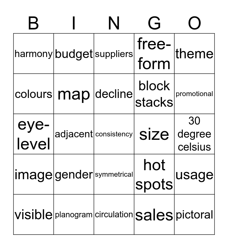 This bingo card has 25 words: image, planogram, consistency, sales, theme, harmony, budget, suppliers, size, usage, colours, map, circulation, hot spots, promotional, visible, adjacent, decline, block stacks, 30 degree celsius, eye-level, gender, symmetrical, free-form and pictoral.