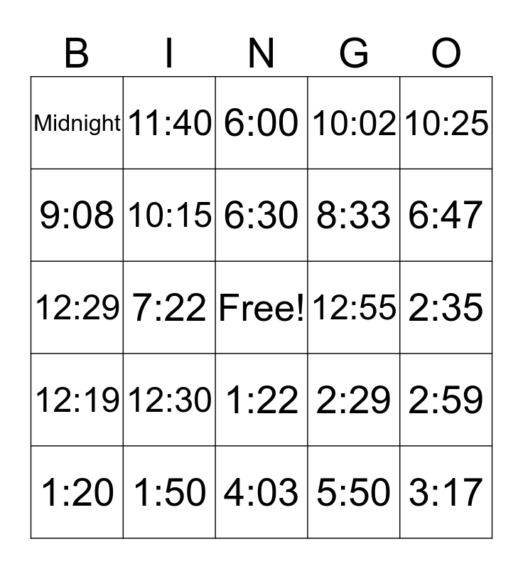 This bingo card has a free space and 29 words: 1:20, 5:30, 7:22, Noon, Midnight, 6:00, 10:15, 12:30, 12:55, 1:50, 2:35, 3:17, 4:03, 5:50, 6:47, 7:56, 1:22, 12:19, 10:25, 12:29, 2:29, 7:30, 8:33, 9:08, 10:02, 11:40, 2:59, 6:30 and 5:58.