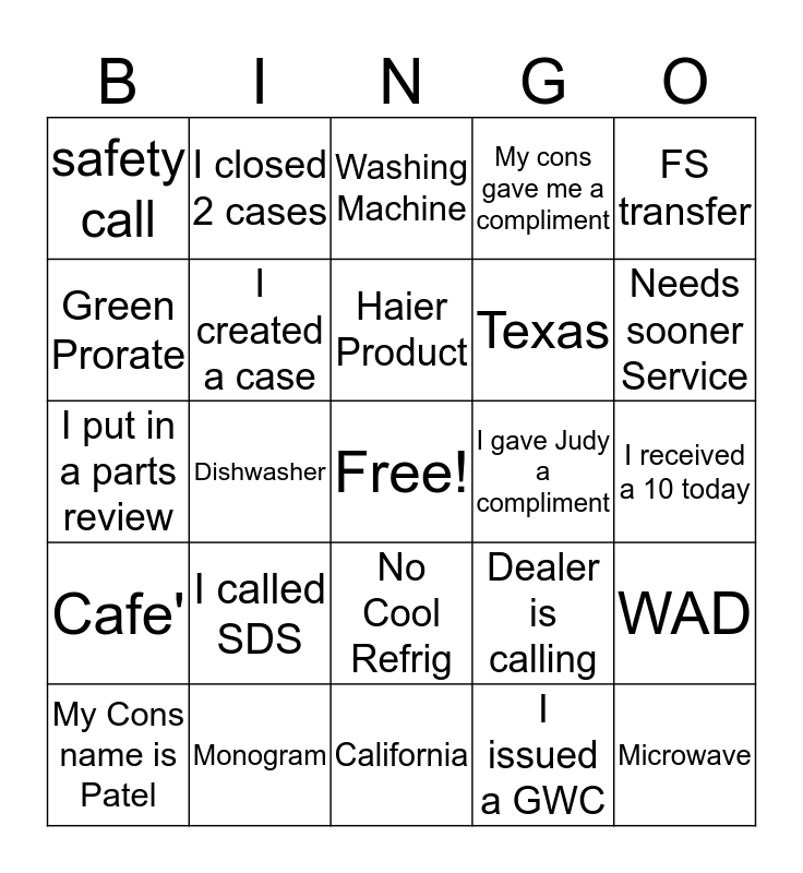 This bingo card has a free space and 24 words: I called SDS, Monogram, Haier Product, My Cons name is Patel, FS transfer, safety call, Green Prorate, I closed 2 cases, I gave Judy a compliment, No Cool Refrig, Texas, I put in a parts review, Dealer is calling, WAD, I created a case, I issued a GWC, I received a 10 today, Washing Machine, Needs sooner Service, Dishwasher, Microwave, Cafe', My cons gave me a compliment and California.