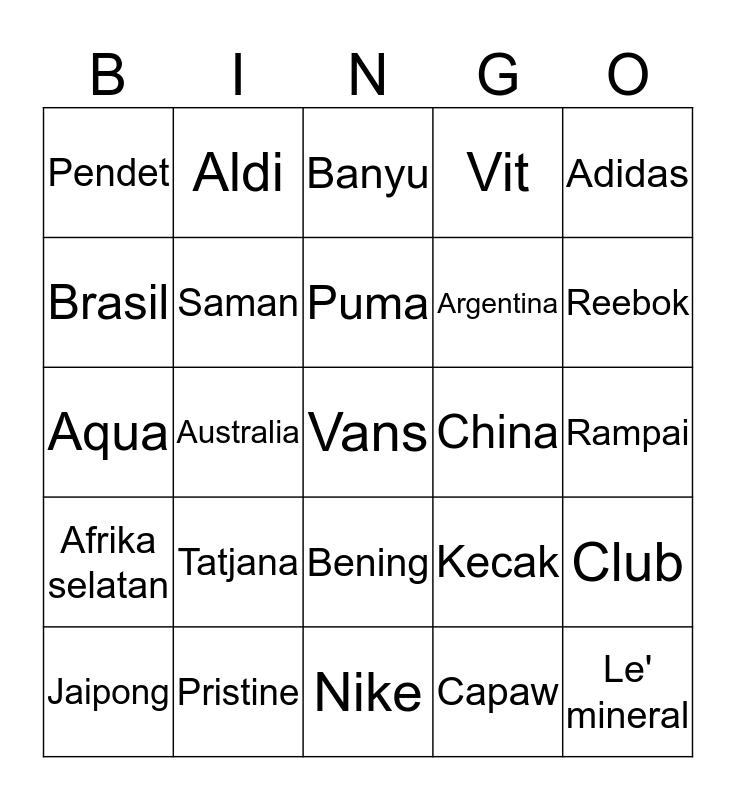 This bingo card has a free space and 24 words: Tatjana, Pristine, Puma, Jaipong, Adidas, Pendet, Brasil, Aldi, China, Bening, Argentina, Aqua, Kecak, Club, Saman, Capaw, Rampai, Banyu, Reebok, Australia, Le' mineral, Afrika selatan, Vit and Nike.