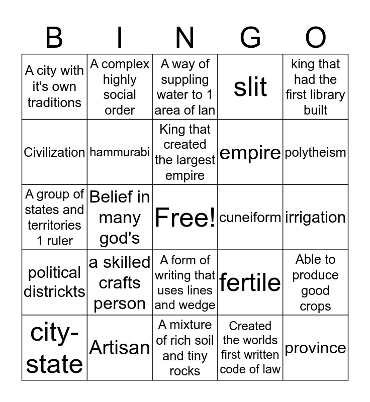 This bingo card has a free space and 24 words: a skilled crafts person, Artisan, King that created the largest empire, city-state, king that had the first library built, A city with it's own traditions, Civilization, A complex highly social order, cuneiform, A form of writing that uses lines and wedge, empire, A group of states and territories 1 ruler, fertile, Able to produce good crops, hammurabi, Created the worlds first written code of law, irrigation, A way of suppling water to 1 area of lan, polytheism, Belief in many god's, province, political districkts, slit and A mixture of rich soil and tiny rocks.