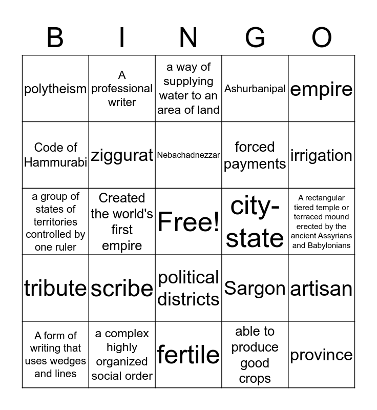 This bingo card has a free space and 28 words: artisan, Silt, forced payments, able to produce good crops, Code of Hammurabi, a way of supplying water to an area of land, A professional writer, tribute, city-state, A form of writing that uses wedges and lines, a group of states of territories controlled by one ruler, Ashurbanipal, a complex highly organized social order, fertile, irrigation, a mixture of rich soil and tiny rocks, scribe, ziggurat, Nebachadnezzar, political districts, polytheism, a skilled craftsperson, province, Created the world's first empire, A rectangular tiered temple or terraced mound erected by the ancient Assyrians and Babylonians, Sargon, empire and created the world's first written law.